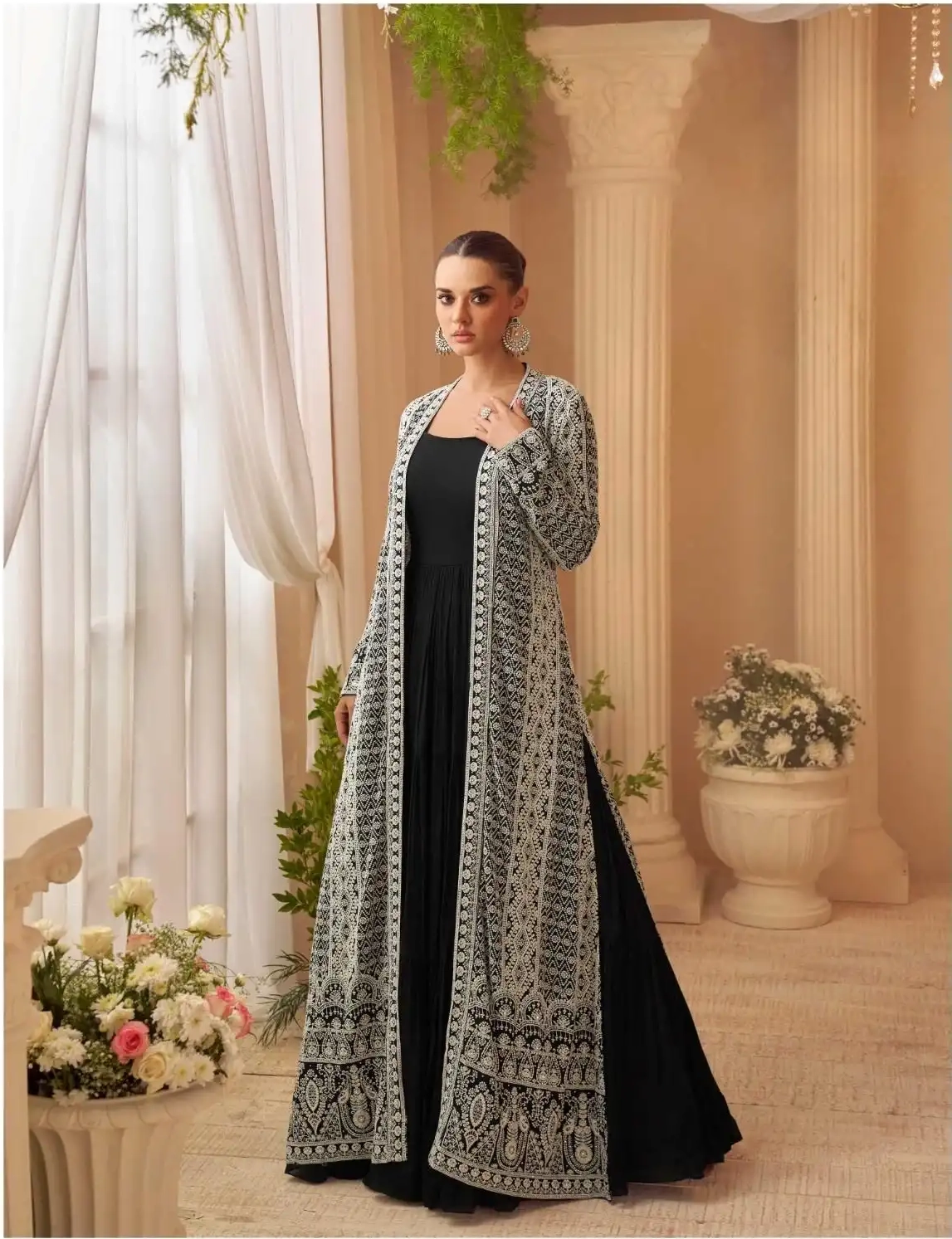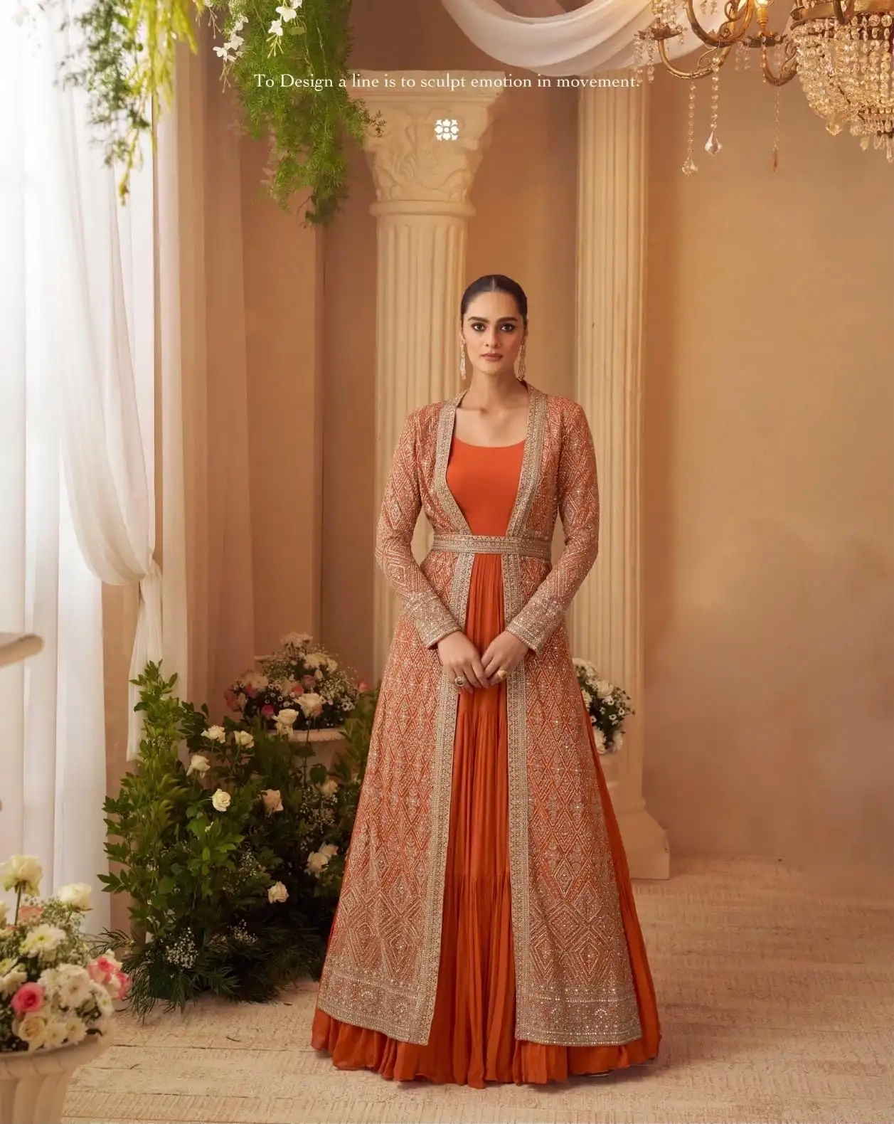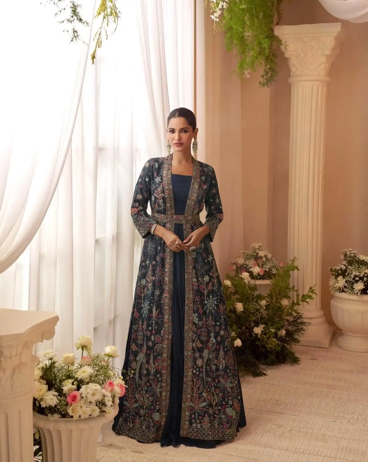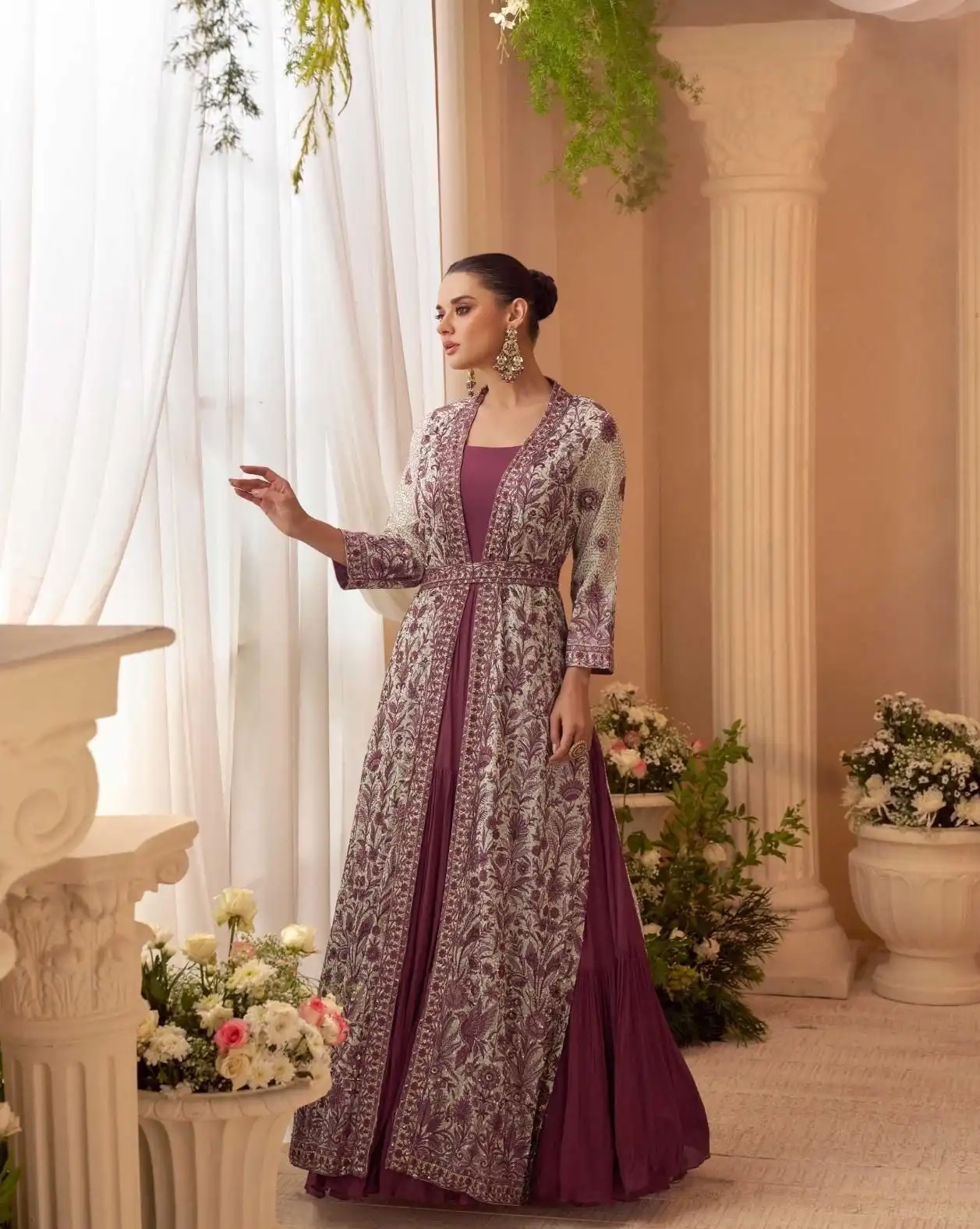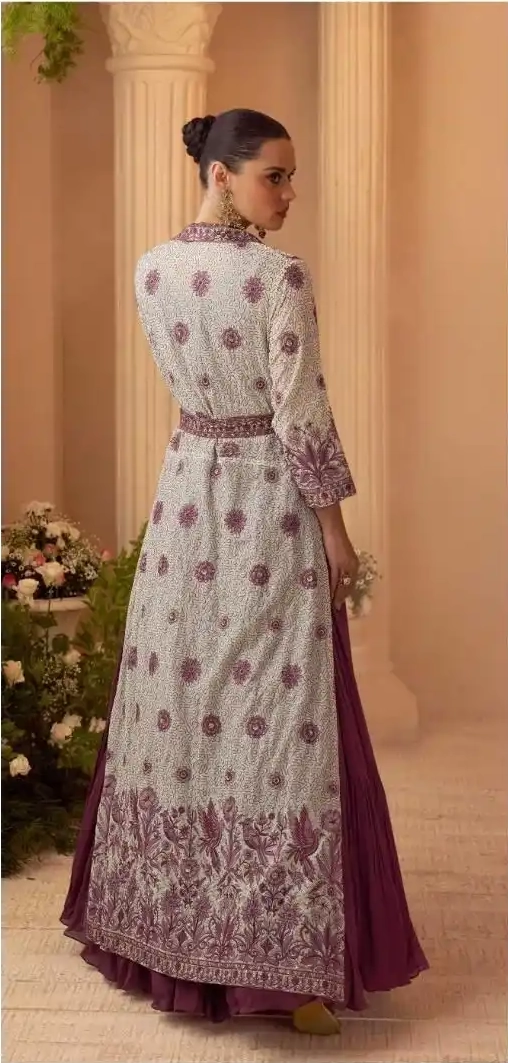 FABRIC – PREMIUM REAL CHİNNON SILK ( TREDY WEDDING LOOK FRONT AND BACK HEAVY EMBROIDERED JACKET WITH BELT AND CHINON SILK GOWN )
