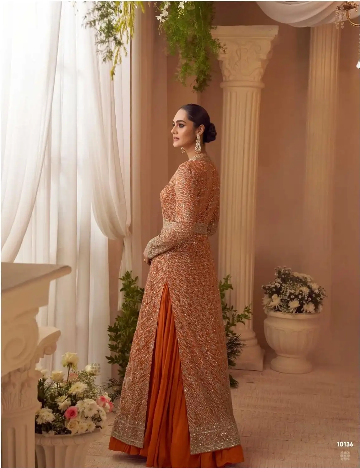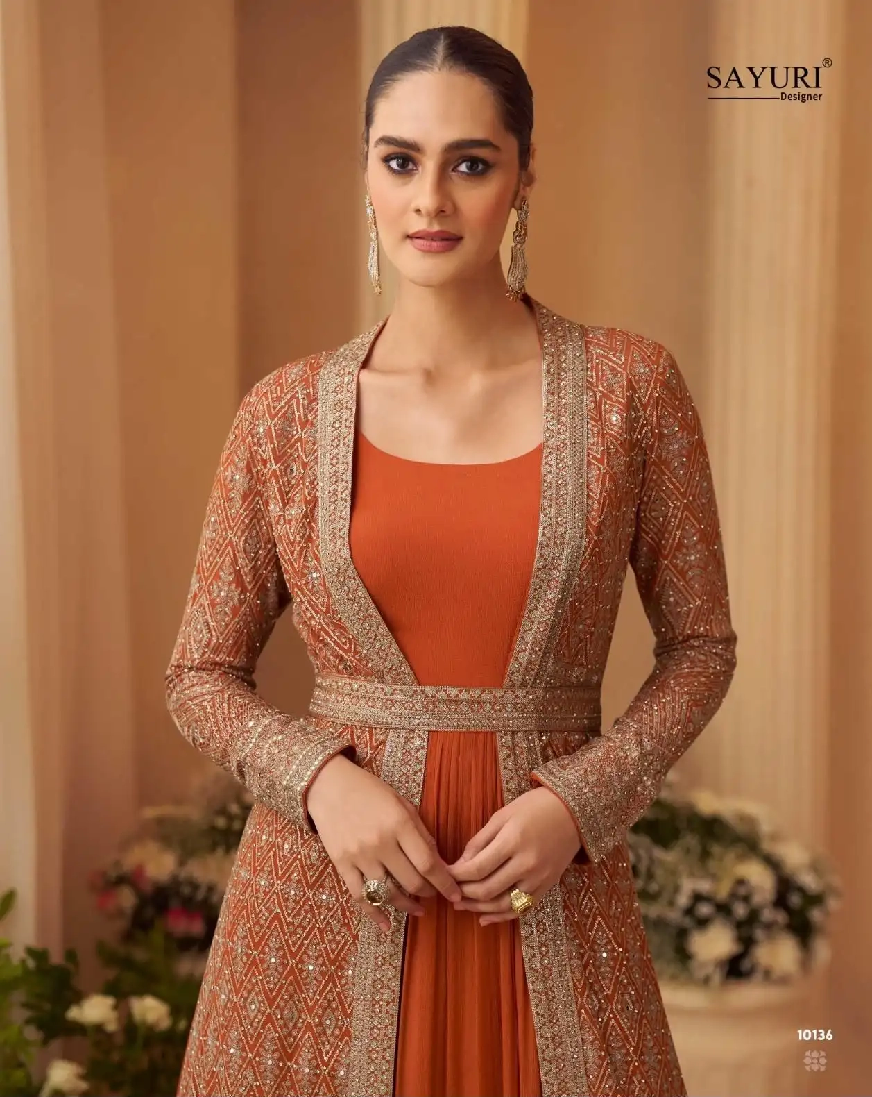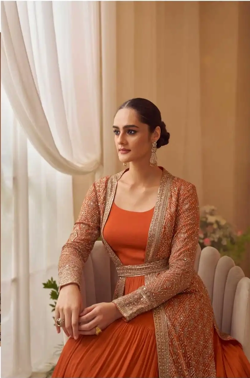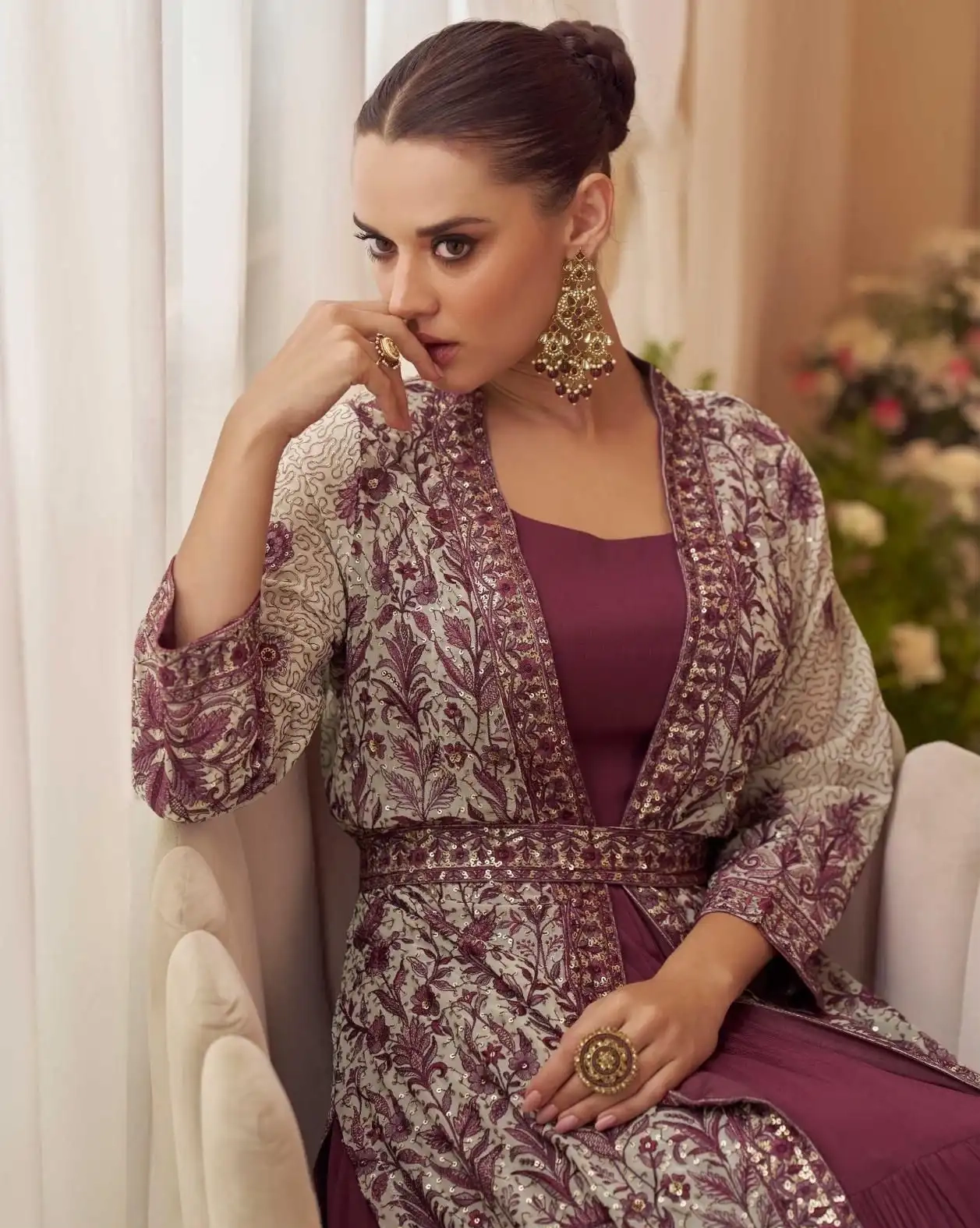 FABRIC – PREMIUM REAL CHİNNON SILK ( TREDY WEDDING LOOK FRONT AND BACK HEAVY EMBROIDERED JACKET WITH BELT AND CHINON SILK GOWN )
