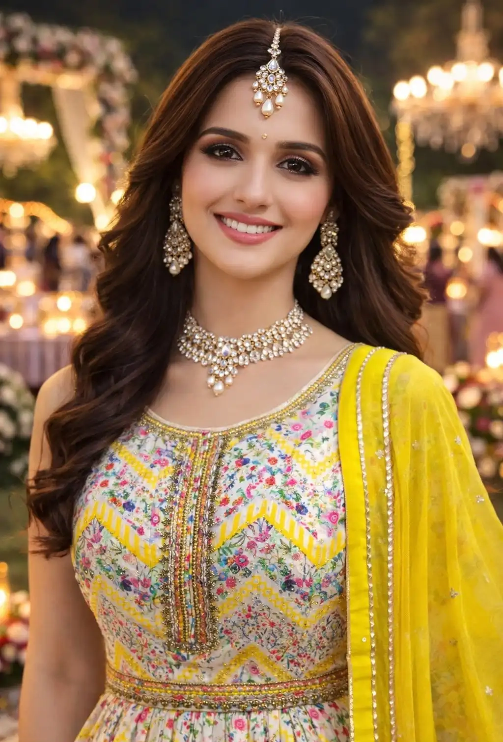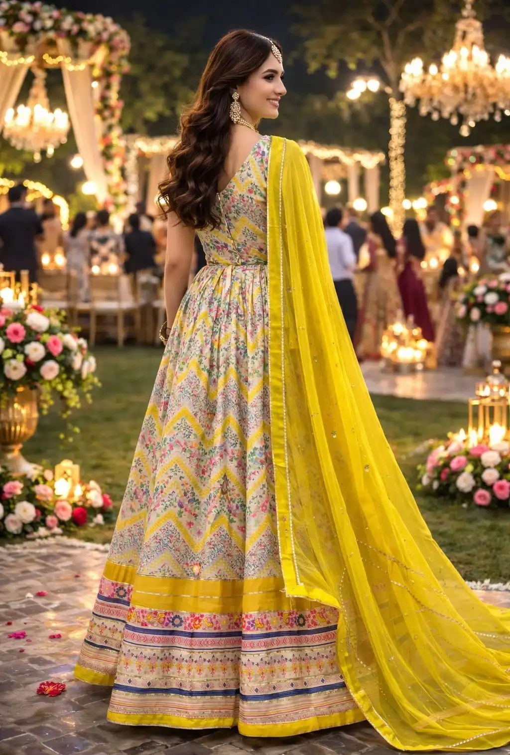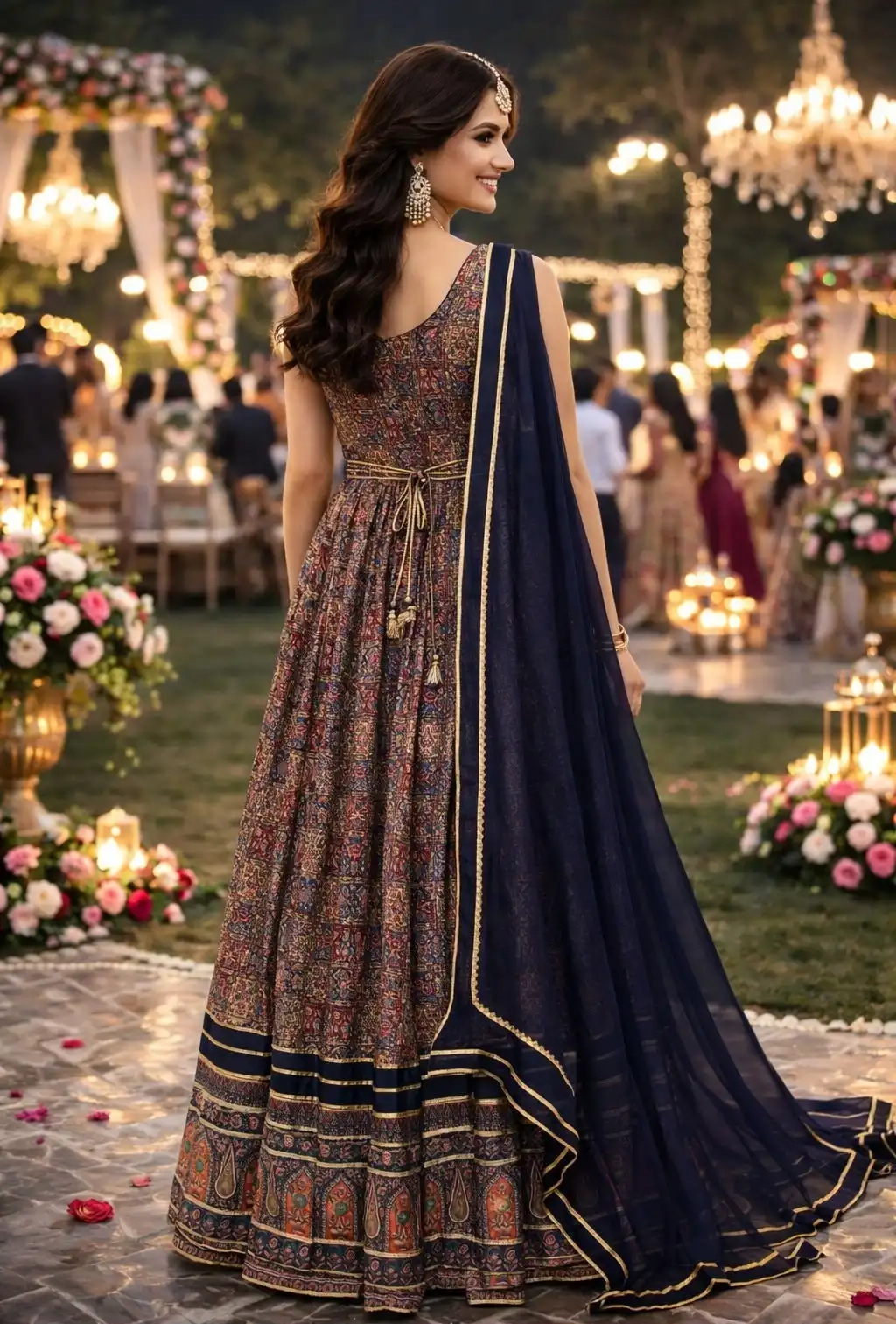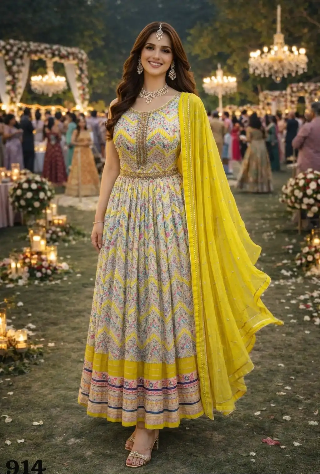 FABRIC – PREMIUM REAL SOFT DOLA SILK ( TRENDY WEDDING LOOK FRONT AND BACK PRINTED GOWN WITH BELT HANDWORK IN NECKLINE AND CHINON DUPATTA)