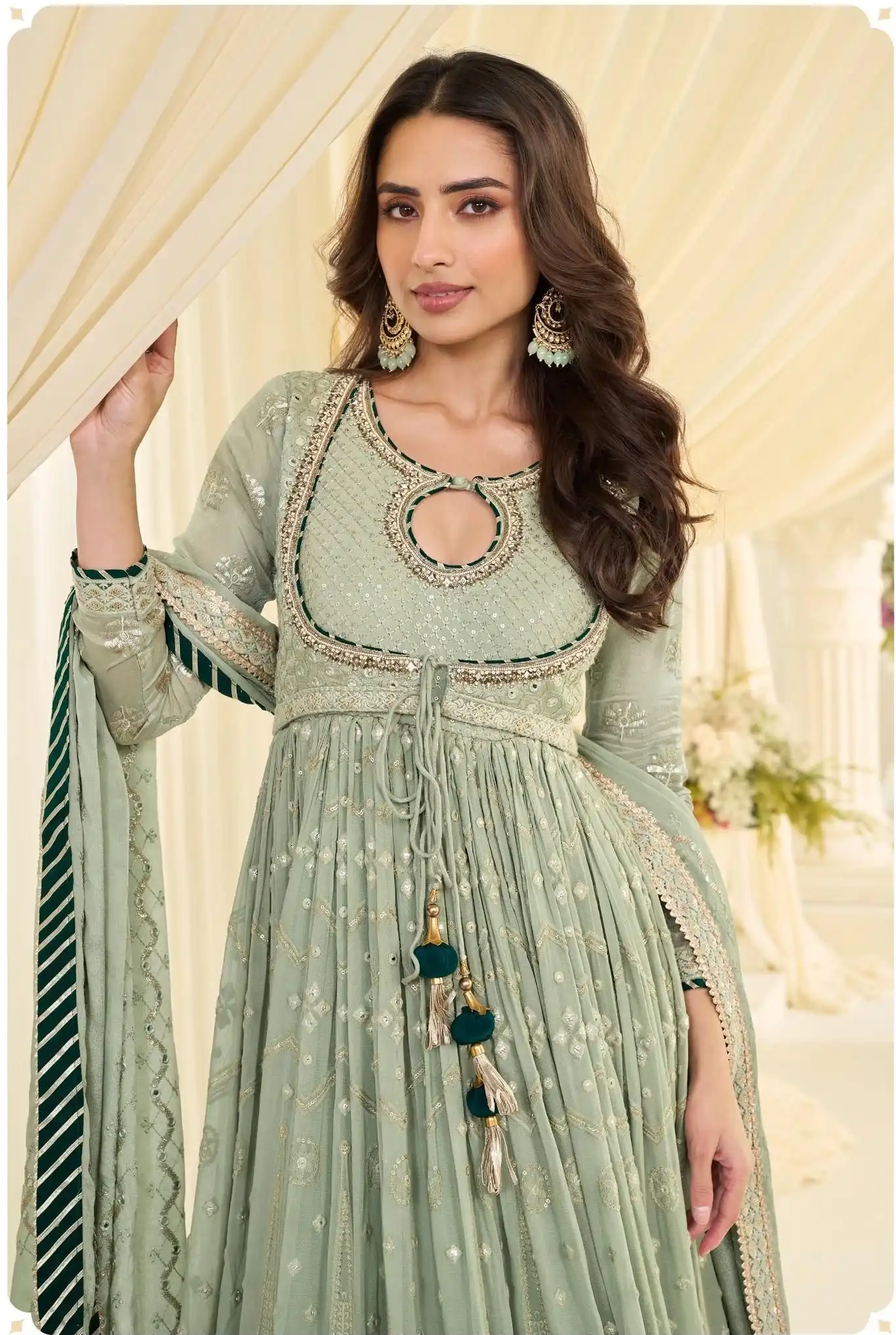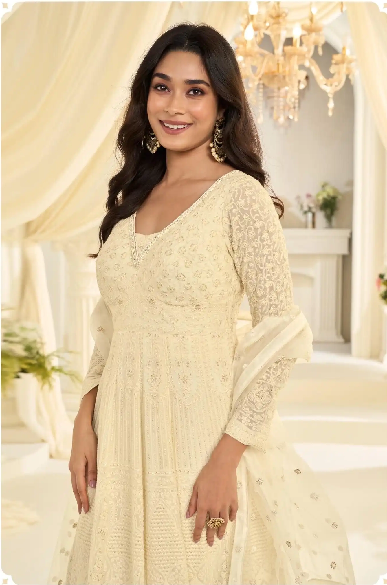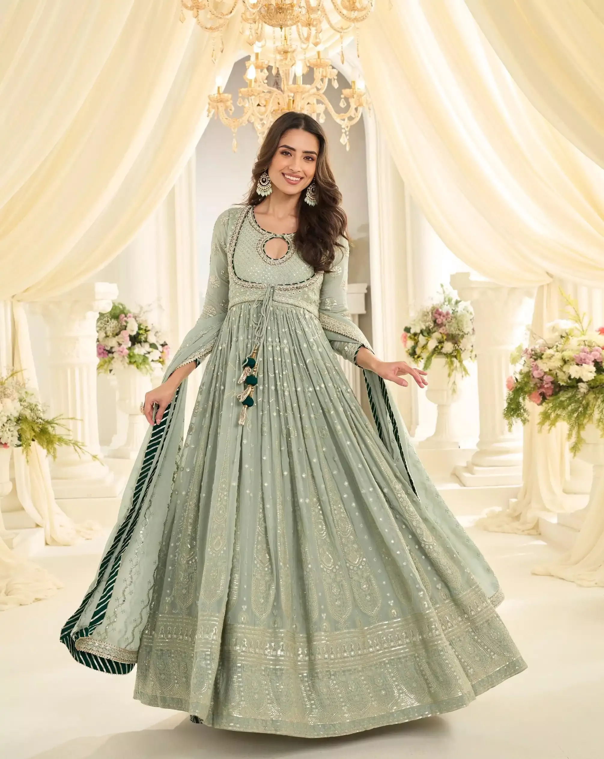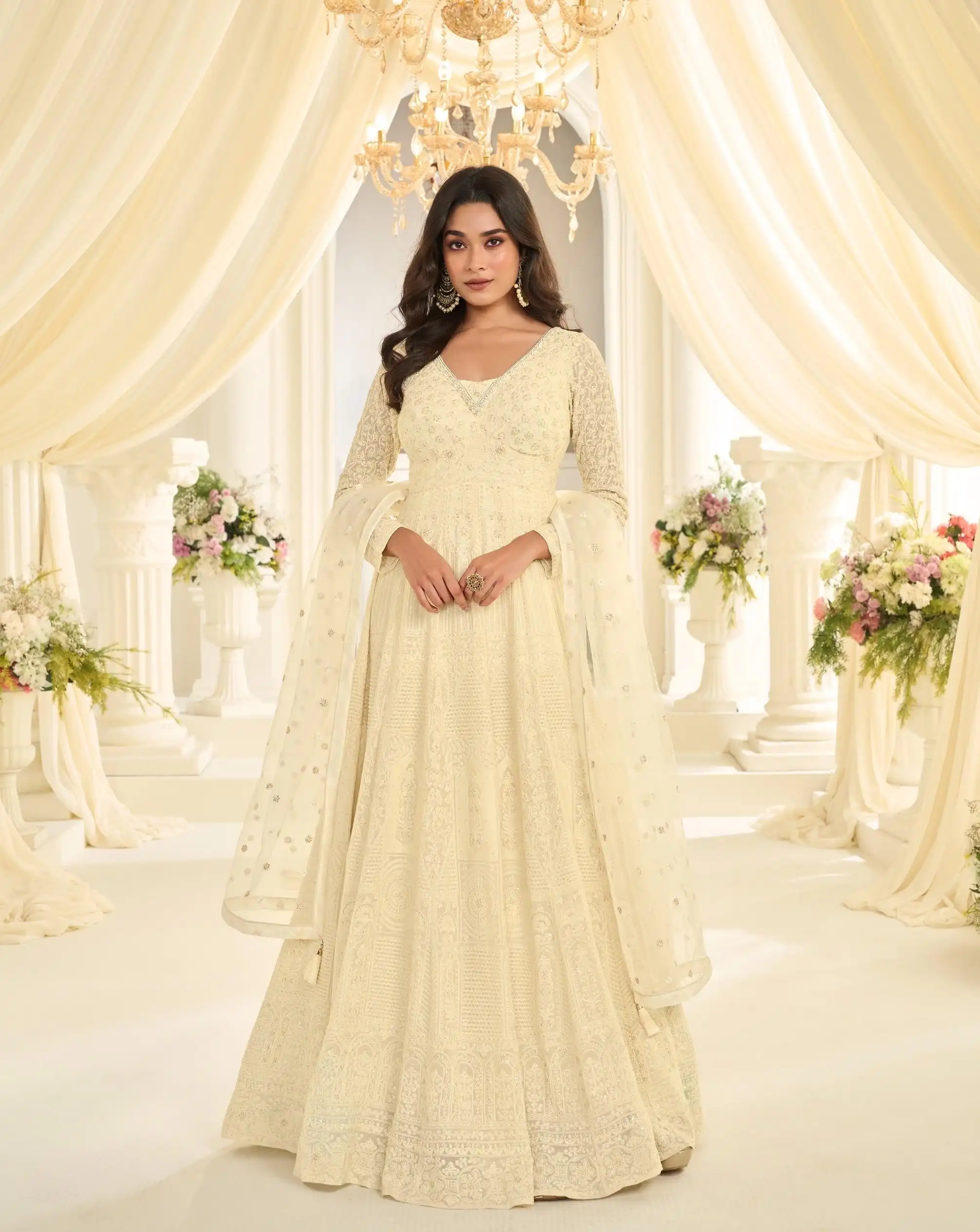 FABRIC – PREMIUM REAL GEORGETTE ( HEAVY FESTIVE LOOK LUCKNAVI CHIKANKARI FRONT AND BACK FULLY HEAVY EMBROIDERED GOWN WITH EMBROIDERED DUPATTA )