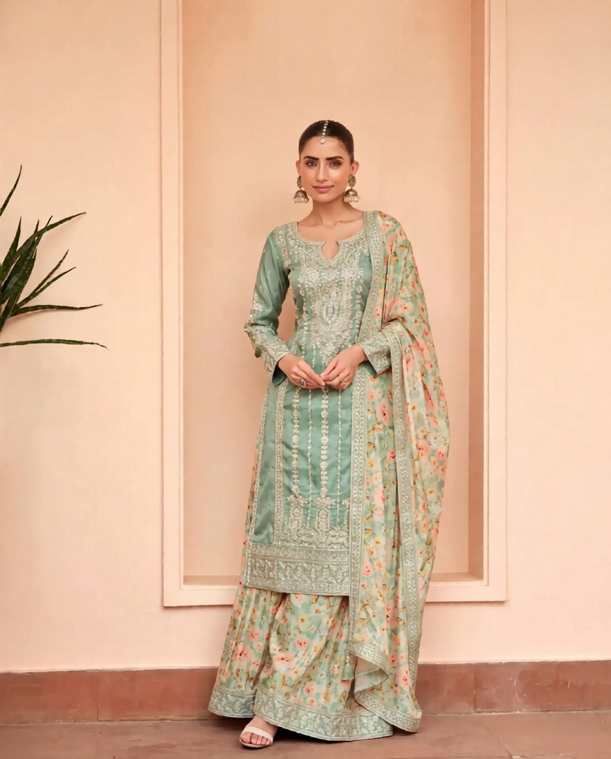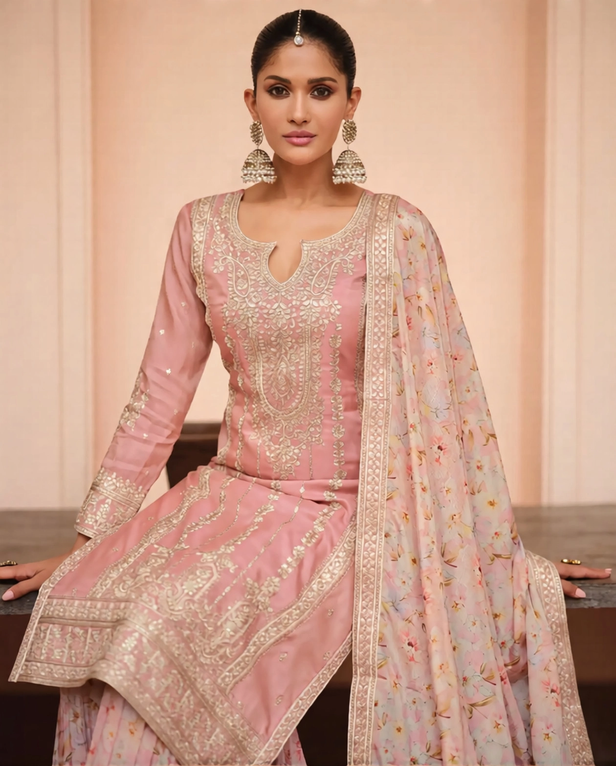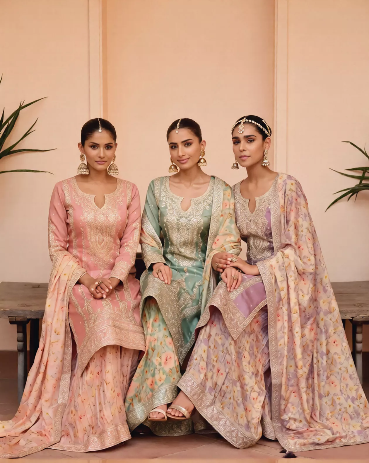 FABRIC – PREMIUM REAL SIMAR SILK / VISCOS JACQUARD SILK / REAL CHINON SILK ( HEAVY FESTIVE LOOK TOP WITH FRONT AND BACK EMBROIDERED SHARARA WITH DIGITAL EMBROIDERED DUPATTA )