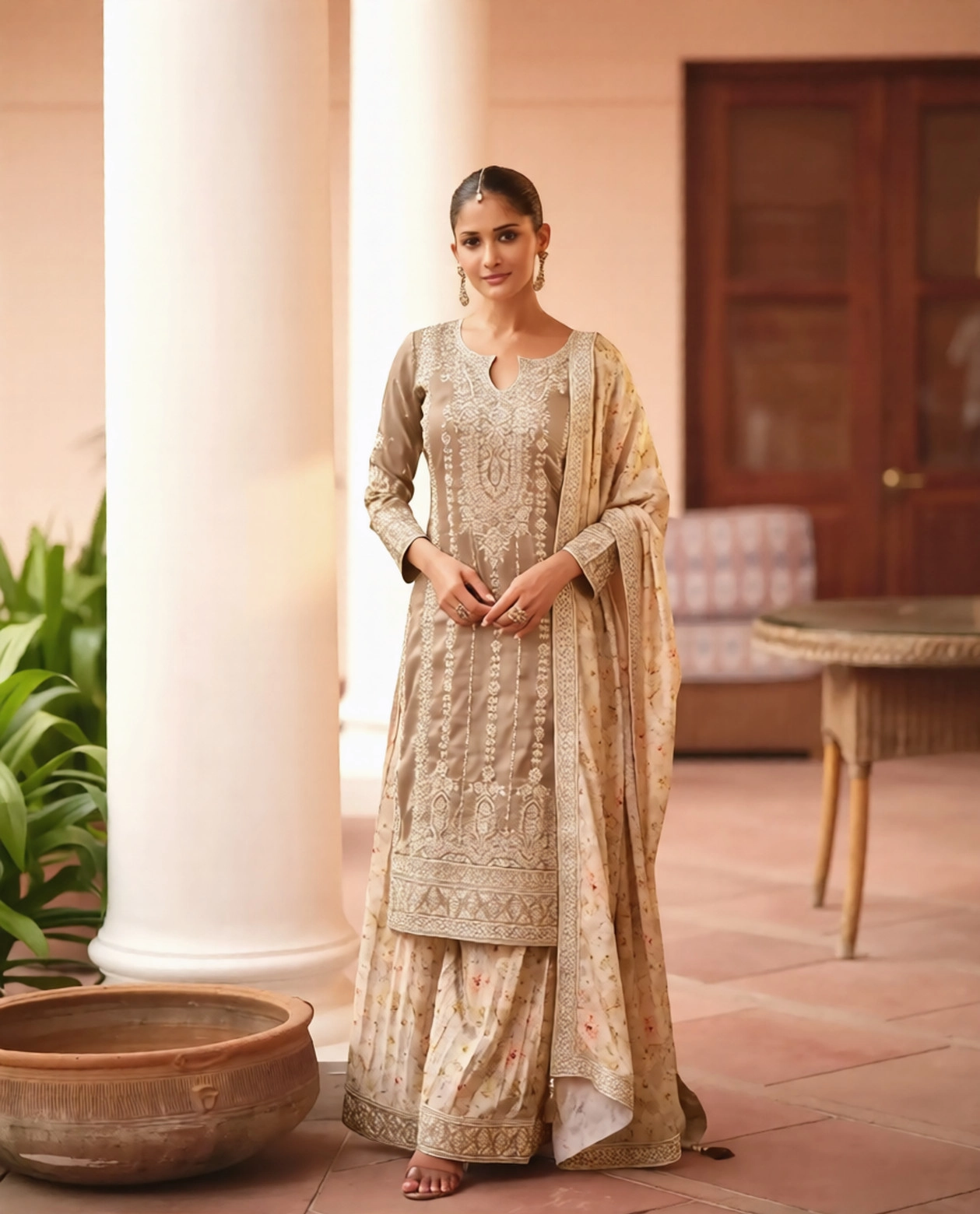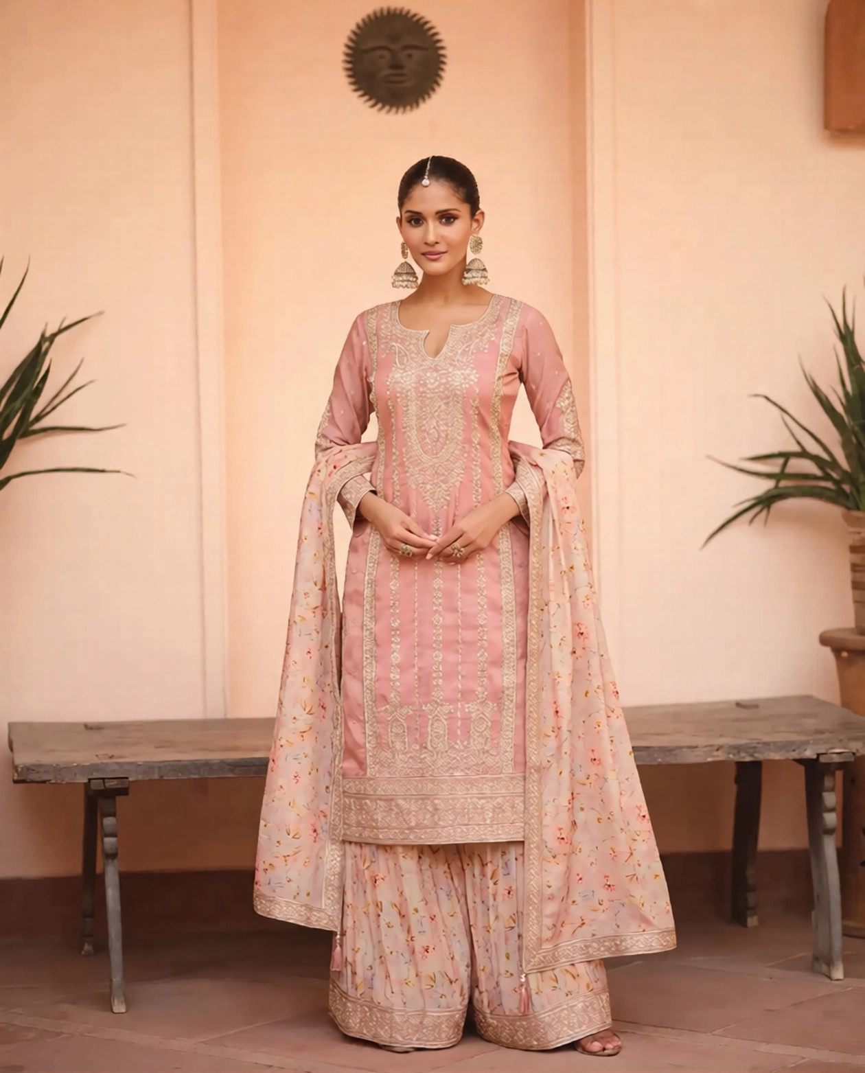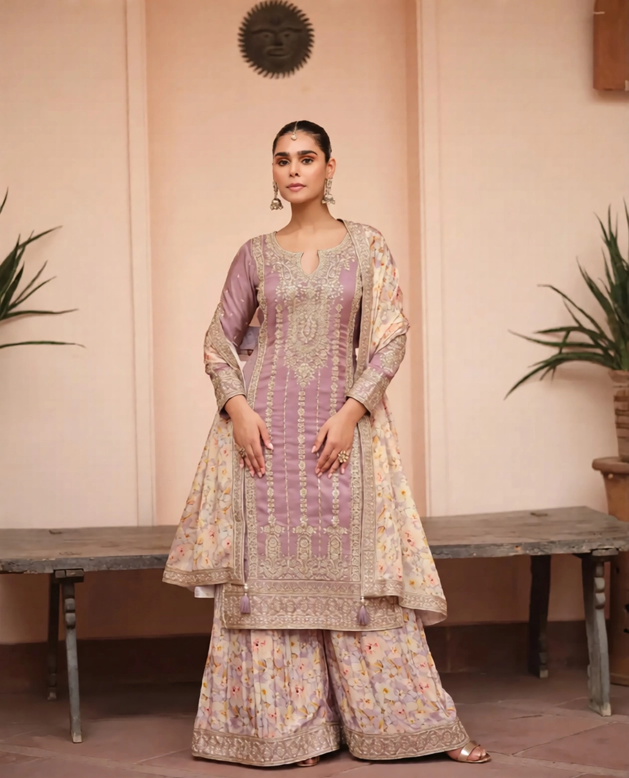 FABRIC – PREMIUM REAL SIMAR SILK / VISCOS JACQUARD SILK / REAL CHINON SILK ( HEAVY FESTIVE LOOK TOP WITH FRONT AND BACK EMBROIDERED SHARARA WITH DIGITAL EMBROIDERED DUPATTA )