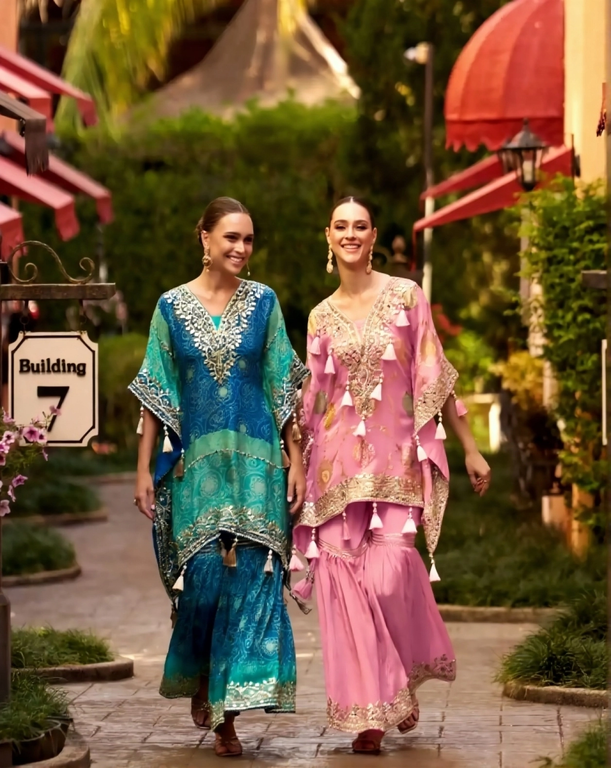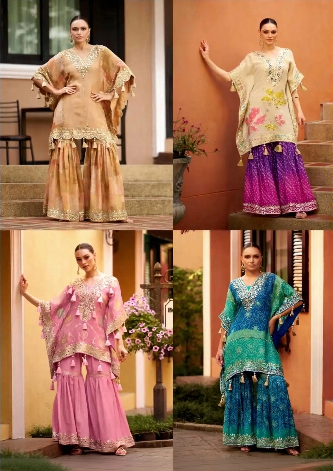 FABRIC – PURE VISCOS JACQUARD SILK / REAL PREMIUM CHINON SILK ( LATEST TRENDY KAFTAN WITH GHARARA ON HAND MIRROR WORK AND HAND EMBLLISHED GOTA PATTI WORK ALL OVER DETALING )
